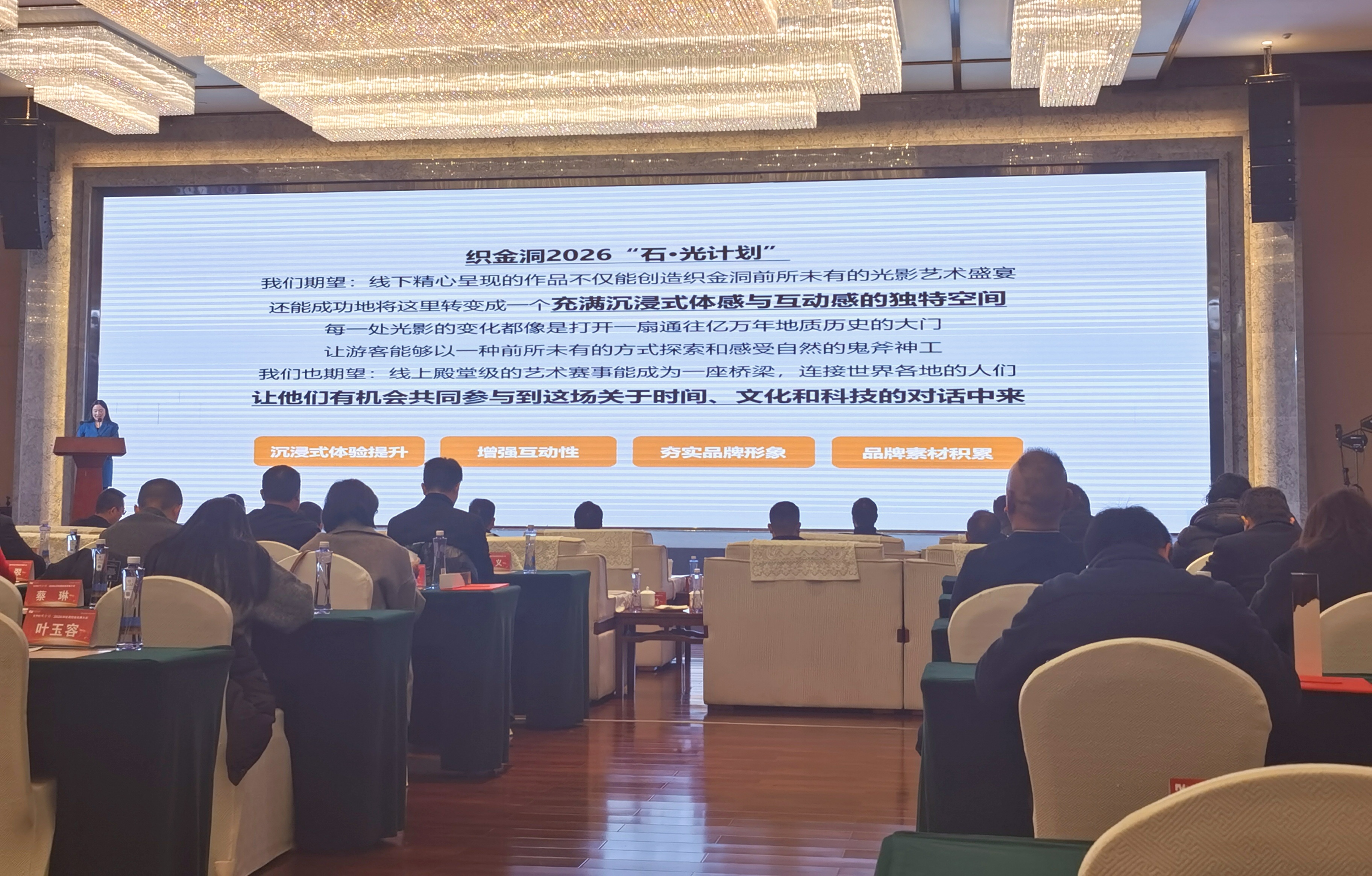会上,织金洞景区对2026年即将启动的“石·光计划”进行了重磅预告。该计划将耗资近亿元,以科技赋能自然遗产,深度融合光影艺术与喀斯特地质奇观,深度讲好中国世界级瑰宝的艺术故事。