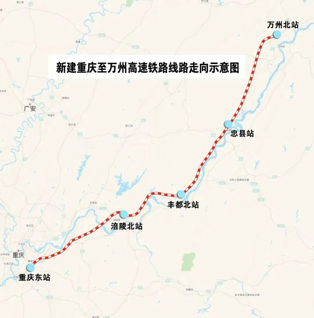正线全长251公里,设计时速350公里,全线共设重庆东、涪陵北、丰都北、忠县、万州北5座车站。