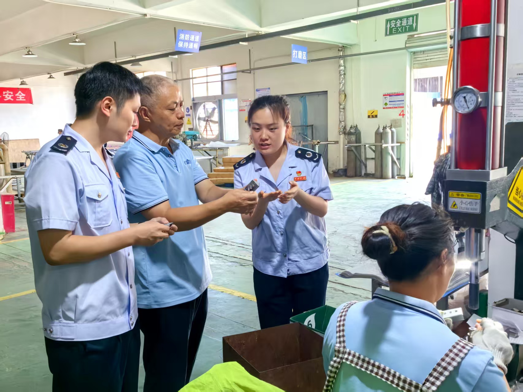 图为税务人员在星原意力发公司了解企业产品生产情况。(摄:童霖)