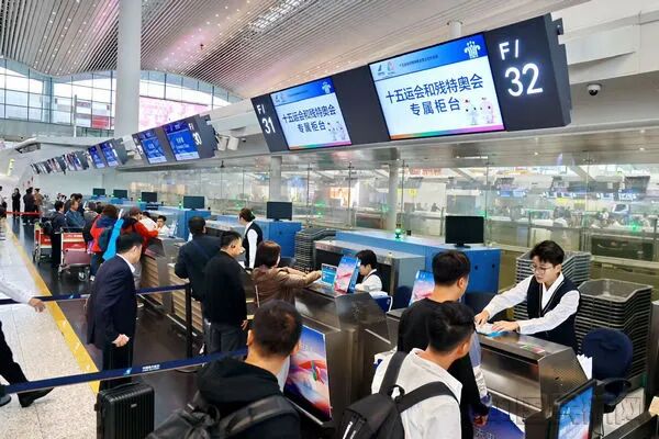 为更好服务十五运会赛事相关人员,南航在广州白云国际机场F值机区常态化开设值机专柜,对中转涉赛旅客设立中转值机柜台与专属安检通道。针对运动员出行存在的运动器材、医疗设备多的情况,南航提供专业包装、优先托运、粘贴专属标识等服务。南航重点关注残特奥会运动员,精准对接轮椅旅客需求,提供值机高效办理、装备单独贴标、联动安检、登机口“一对一”引导与无障碍衔接等服务,让轮椅旅客感受全程无忧的乘机体验。此外,全新推出的十五运会和残特奥会主题登机牌,实现了“出行工具+赛事纪念+服务载体”的三重融合,让赛事旅途绽放南航温度。