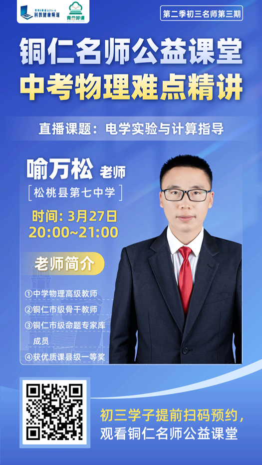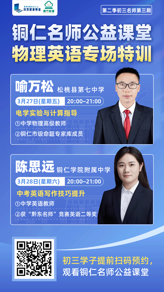 青云好课・铜仁名师公益直播课堂第三期直播定于3月27日(周五)20:00-21:00,松桃县第七中学喻万松老师与铜仁学院附属中学陈思远老师将作为嘉宾亮相直播间!两位优秀骨干教师深耕初中教学一线多年,对中考命题规律、学生易错点及提分策略有着深刻研究,此次他们将以“中考科目核心考点”为主题,结合历年真题案例,拆解高频考点、梳理答题逻辑,帮孩子把“模糊努力”转化为“精准得分”。