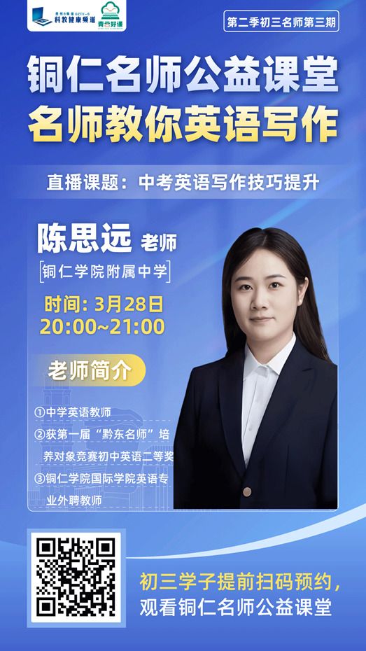 为深入贯彻落实教育惠民政策,切实解决初三学子备考中的实际困惑,由贵州广播电视台教育事业部与铜仁市教育局联合主办、铜仁市各初级中学深度参与的《青云好课・铜仁名师公益直播课堂》(第二季)第三期将于3月27起正式开播!这是专为初三学子定制的全免费、高含金量中考冲刺公益课,贵州广播电视台以 “青云” 为名,打造名师公益直播课。依托全省顶尖名师资源,把优质课堂搬上 “云端”,跨越山川惠及更多学子。以名师引路、课程为阶,助学子拾级而上,触摸属于自己的“青云之志”。“青云好课”愿做托举之风,助力每个孩子的梦想都如“青云”般“云程发轫,万里可期”。