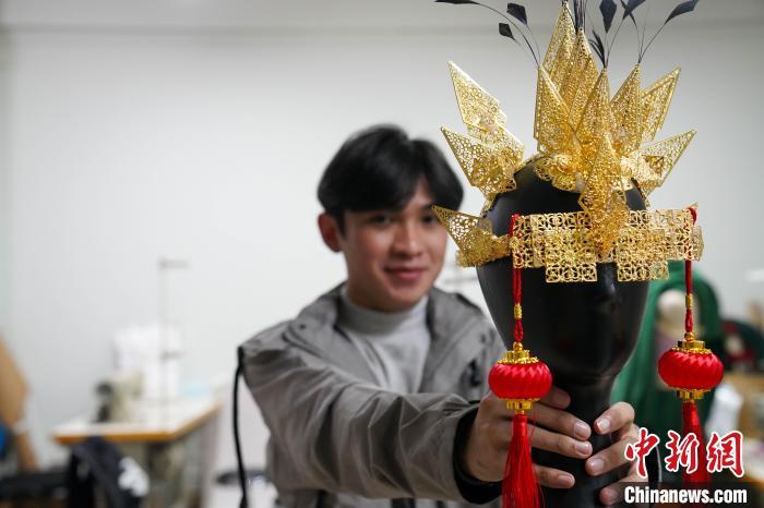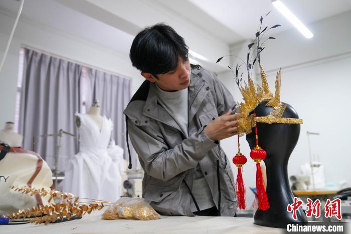 中新网南宁电 春日午后,广西艺术学院的操作室里,裴优术旋转着头型模具,在金色的头饰顶部插上几根羽毛,左右两边挂上红色小灯笼,一个融合印度尼西亚和中国文化特色的装扮出现在眼前。