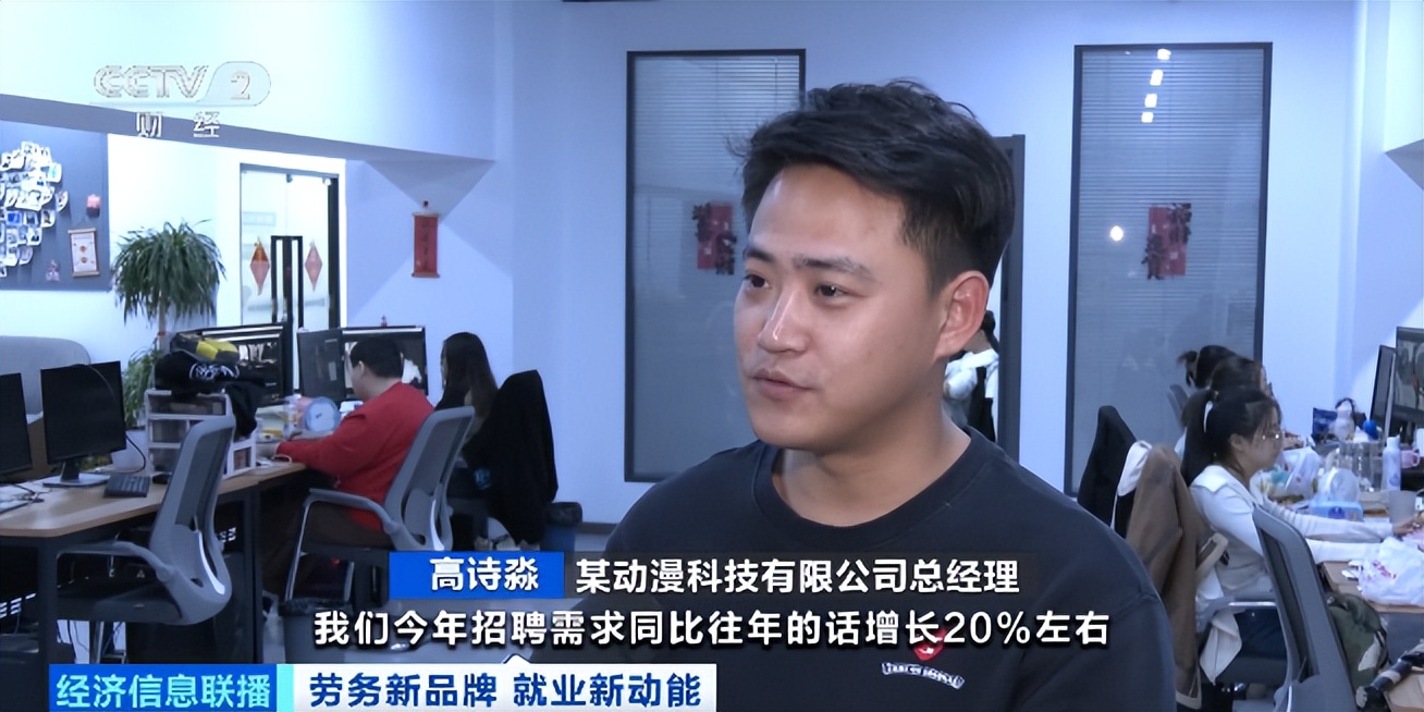 某动漫科技有限公司总经理 高诗淼:我们今年招聘需求同比往年增长20%左右,主要是动画师,然后今年多了一些AI动画、UE动画技术人才(的需求)。