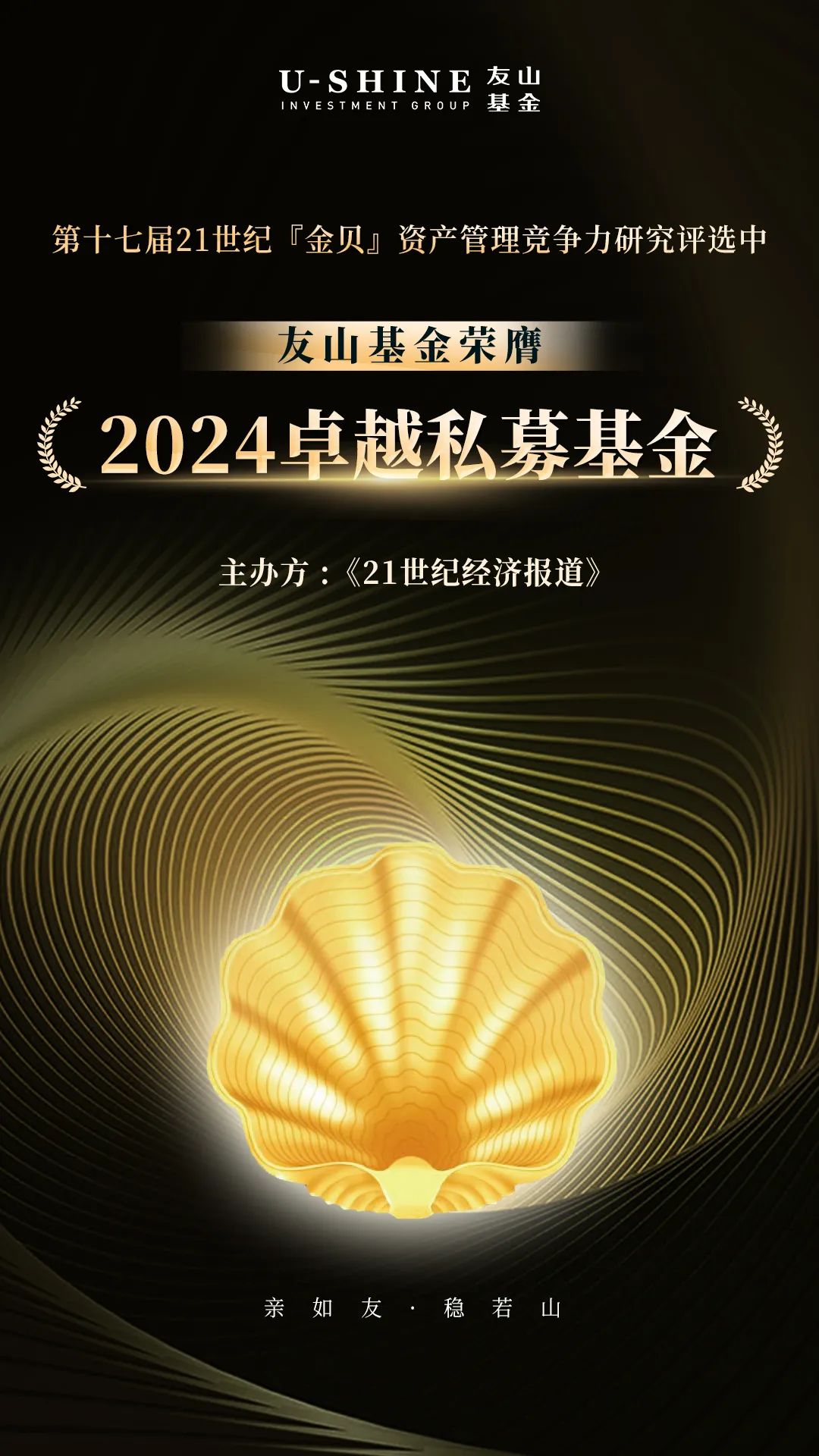 8月17日,由南方财经全媒体集团指导、21世纪经济报道主办的“2024资产管理年会”暨“资产管理竞争力研究案例发布盛典”活动在上海成功举办,经过层层遴选,备受业界关注的2024「金贝」资产管理竞争力榜单发布,友山基金获颁“2024卓越私募基金”荣誉。