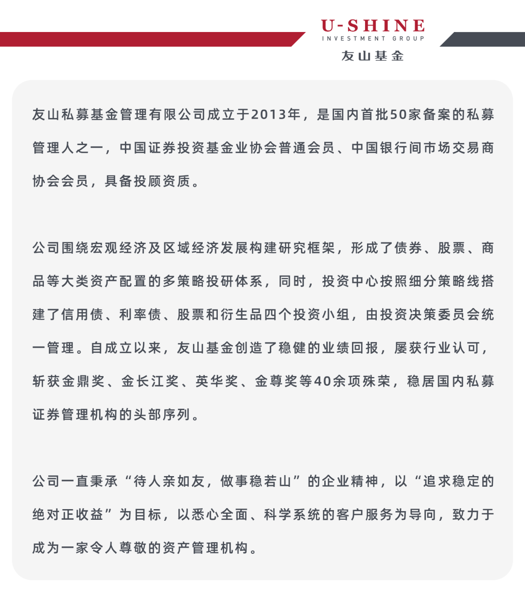 荣誉的背后既是对专业服务的匠心坚守,更是要求自我打磨的精益求精,未来,友山基金将继续夯实投资、投研基本功,与客户“亲如友”温暖相伴,在变化中 “稳若山”开拓向前,通过更加专业、稳健、安全的服务为投资者提供可持续的价值回报。