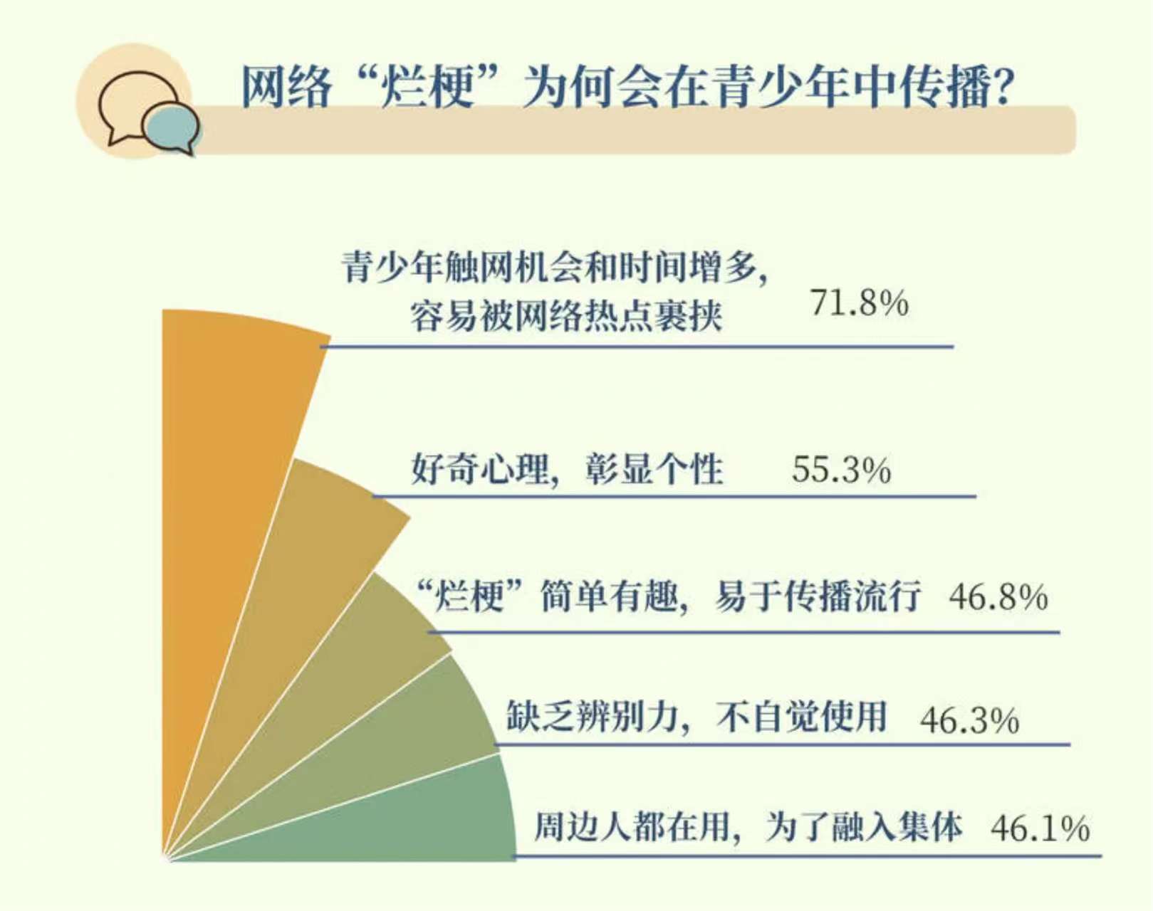 这并非网络“烂梗”第一次引发担忧。此前,中国青年报的一项调查显示,69.0%的受访者担心网络“烂梗”泛滥影响青少年“好好说话”,受访家长对此有担心的比例更高,为74.4%。超半数受访者认为网络“烂梗”会导致青少年乱用词汇和养成不文明的语言习惯。
