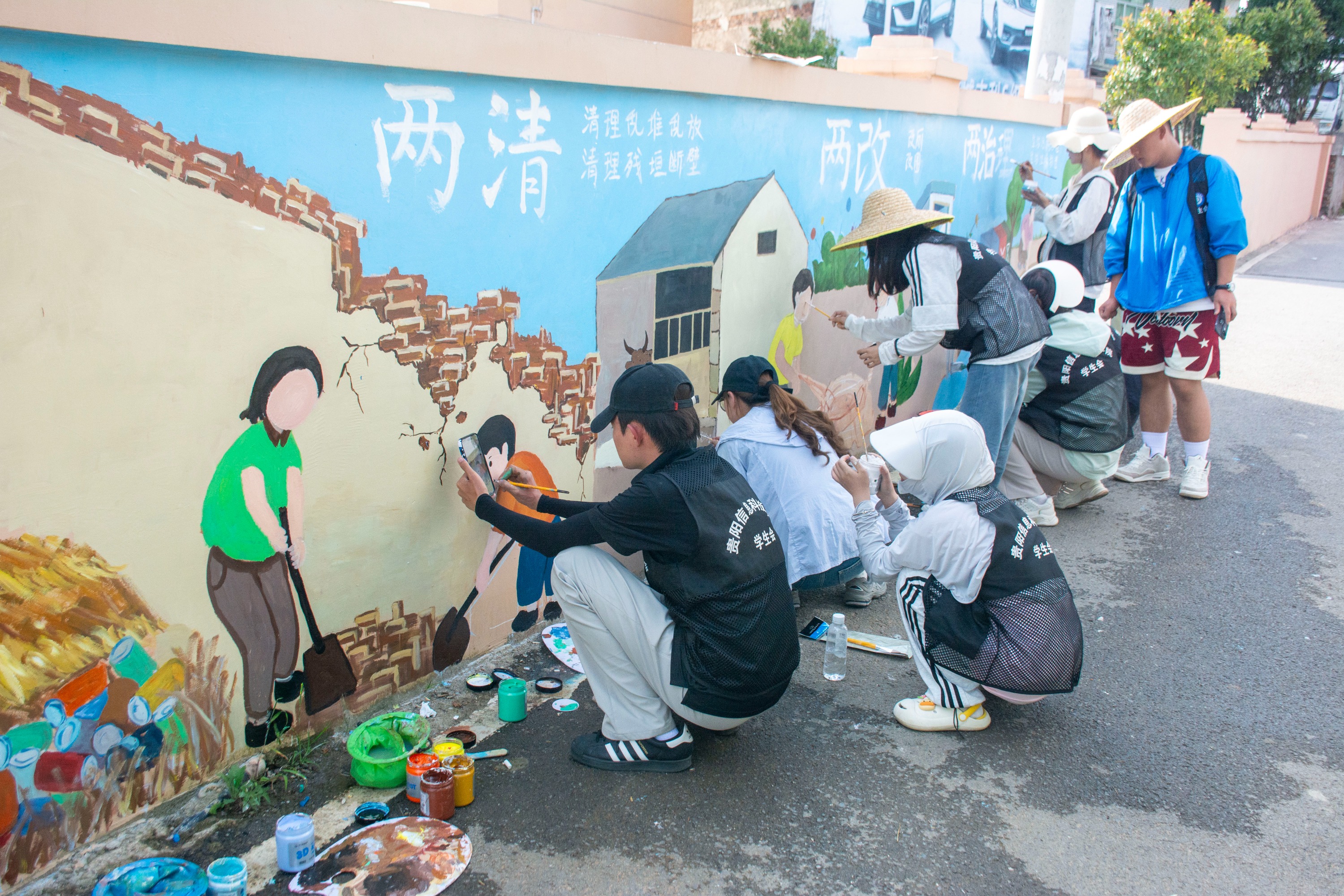 三天内,实践队完成3面总面积超50平方米的墙绘作品,这些墙绘成为站街镇“两清两改两治理”政策宣传的“活教材”。