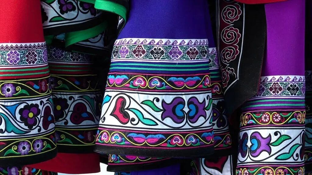 苗族服饰超过200种样式,银饰、苗绣、蜡染特色是它的主要特色。信奉“万物有灵”的苗族,将自然崇拜融入刺绣与蜡染中,山川河流、日月星辰、人与自然都在一方图案上娓娓道来。