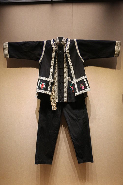 仡佬族男装 上衣为对襟,装饰蓝底挑花蛇皮纹;背心为蓝底挑花平绣花纹;裤子为蓝布裤,配白底挑花几何纹流苏腰带。图源:贵州省民族博物馆