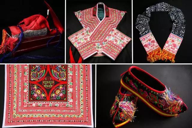 服饰包括从头到脚的服装饰物与内套如脚帕、鞋垫等男女各式;常见的有衣裙、头巾、青白、纯色帕子、帽子、围腰、鞋与鞋垫、花帕子、花背带、小花被等。