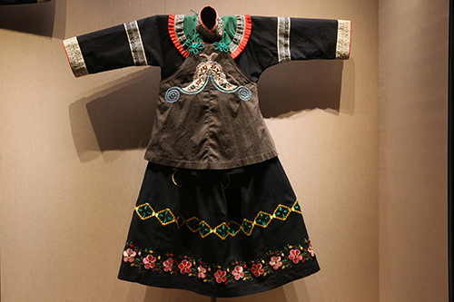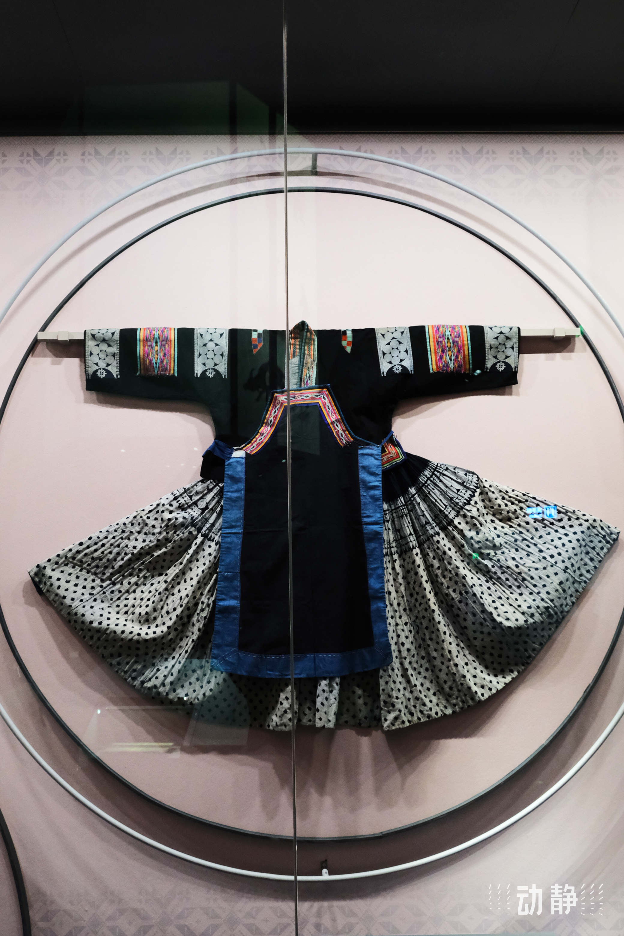 仡佬族女装 上衣为右衽,装饰蓝底挑花蛇皮纹:筒裙为蓝底刺绣铜钱花卉纹;围腰为黑底布贴挑花花卉纹,大方朴素。图源:贵州省民族博物馆
