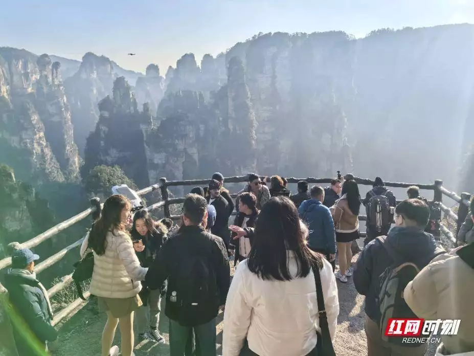 景区工作人员介绍,近期暖冬气候让张家界的冬日景观更具层次感 —— 薄雾缠绕的石英砂岩峰林在晴日下明暗交错,部分区域还保留着初冬的苍翠植被,既避免了寒冬的湿冷,又能欣赏到“云海 + 暖阳”的限定美景。为保障游览体验,景区增派了服务人员在热门点位疏导客流,引导游客错峰游览小众秘境点位。