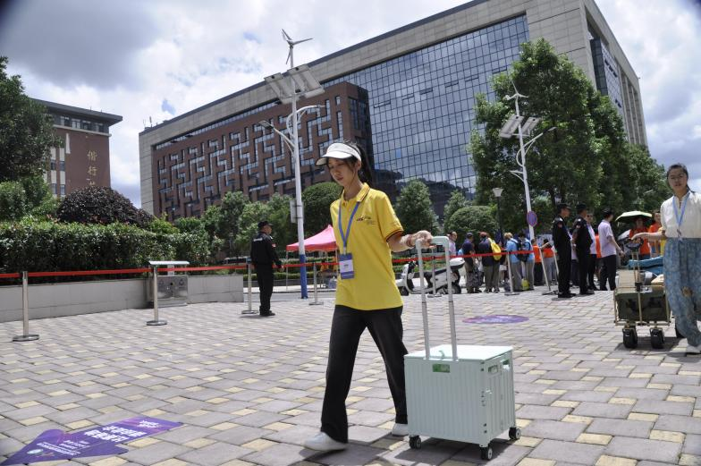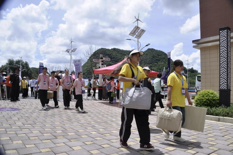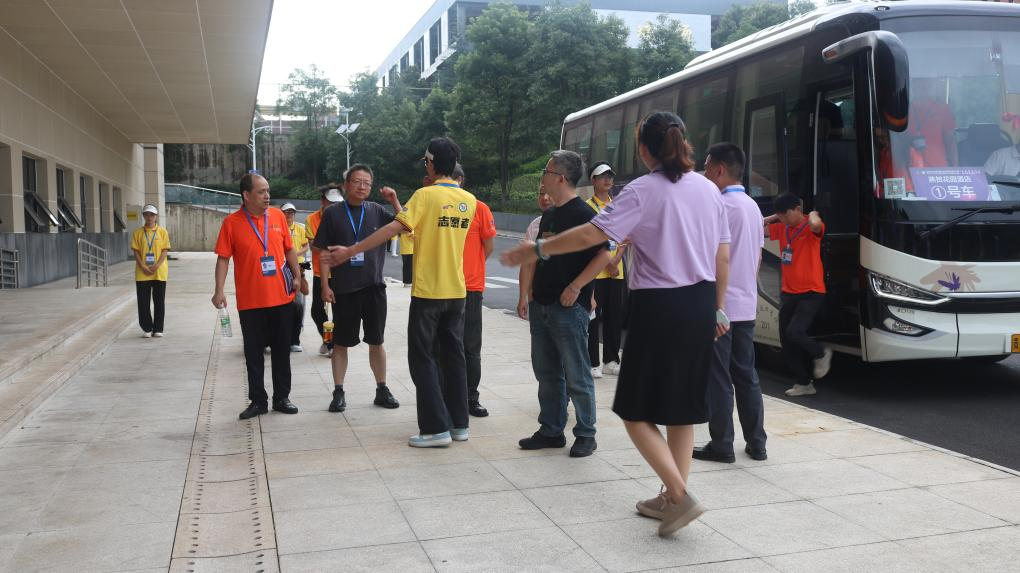 志愿者在入口处迎接抵达的参赛队伍,为参赛队伍指引路线