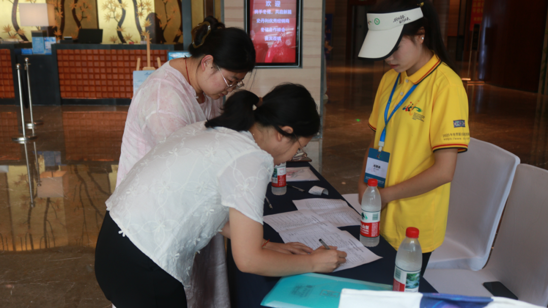 志愿者在酒店前台负责参赛人员接待与签到工作