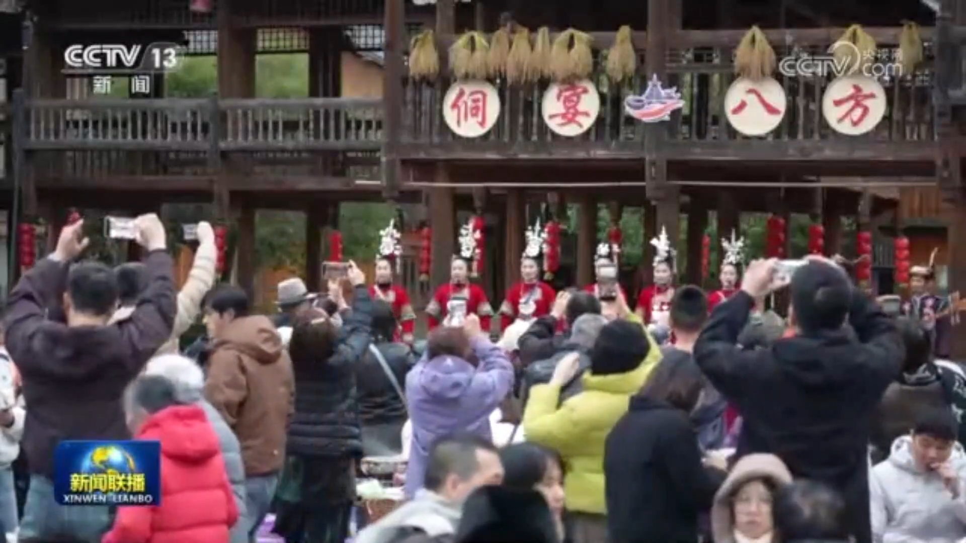 在贵州省黔东南州黎平县,节日里的肇兴侗寨十分热闹,这里有“侗乡第一寨”之称。院坝中摆开几十张圆桌,为游客特意准备了年夜饭。2025年肇兴侗寨接待游客151万人次,村集体经济收入突破300万元。