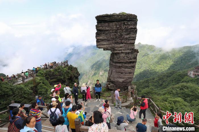6月27日,位于贵州省铜仁市的世界自然遗产地梵净山出现云雾景观,雾气在林间或山顶飘逸,犹如仙境,吸引游客前来观赏、游览、拍照。图为世界自然遗产地梵净山云雾景观吸引游客。
