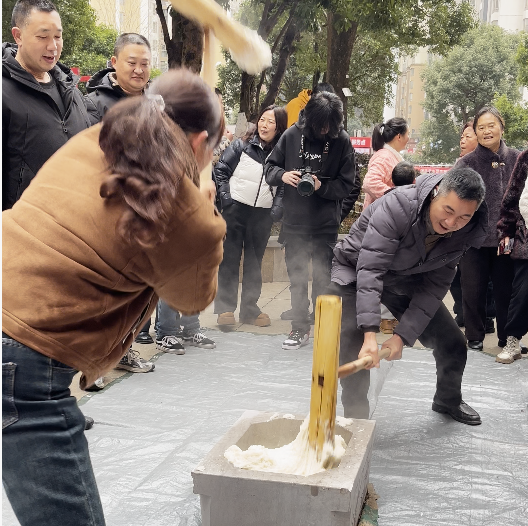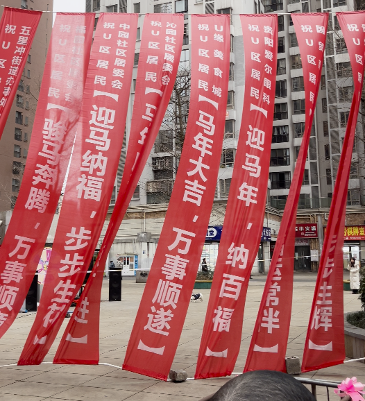 1月31日,花果园U区显得异常地忙碌:杀年猪、布置会场,摆放桌椅,支起炉架、捶打糍粑、撰写春联……摩肩接踵,熙熙攘攘,人声鼎沸,川流不息的人群,既衬托出了热闹的气氛,又井然有序不失方寸。