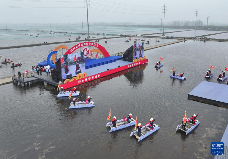 4月3日,2026年盱眙龙虾开捕仪式在江苏省盱眙县淮河镇明祖陵村举行。据介绍,盱眙现有小龙虾养殖面积100万亩,年产量达15万吨,其中稻虾共生模式推广至80万亩,占养殖总面积的八成。全县的小龙虾产业从业人口达12.8万人,总产值已突破400亿元。面向未来,盱眙将继续在种苗研发、精深加工、文旅融合等方面持续发力,为乡村振兴注入更持久的动能。新华社记者 季春鹏 摄