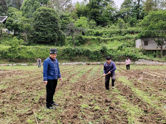 图 :鞠华国(左)在田间自2023年当选全国人大代表以来,身为困牛山村党支部书记兼村委会主任的鞠华国积极为家乡的发展建言献策。他连续两年呼吁支持困牛山战斗遗址申报全国爱国主义教育示范基地,并争取资金以完善遗址保护工程;同时,他积极推动贵阳至铜仁城际铁路过境石阡,以打破当地的交通瓶颈。