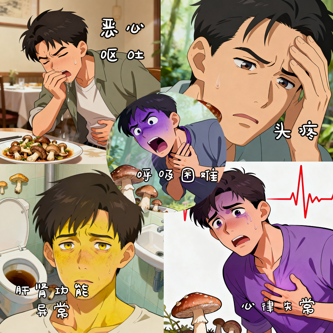 韦卫琴介绍,野生蘑菇中毒症状因蘑菇种类和毒素类型而异,主要表现为五大类症状: