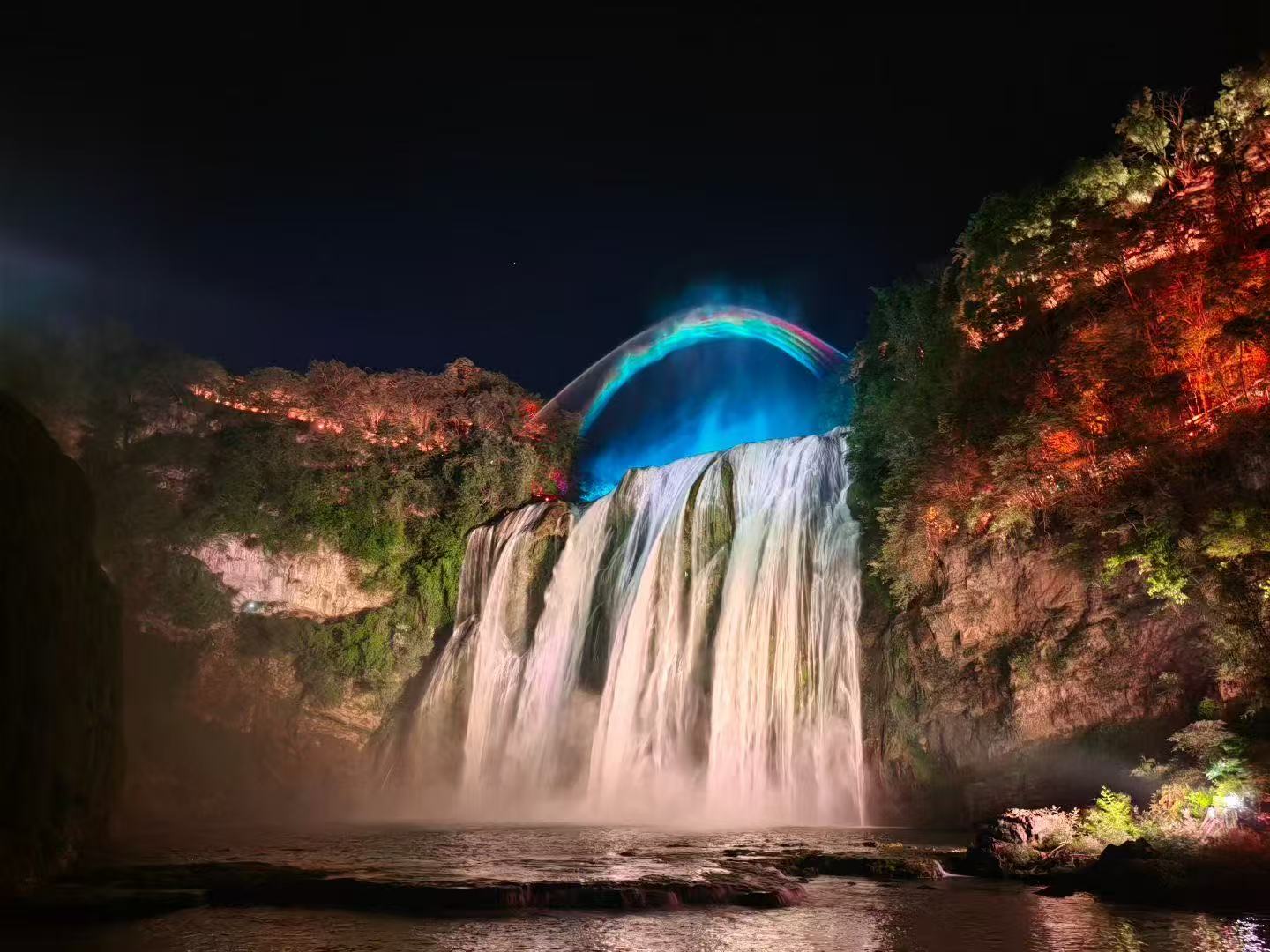 事实上,此类“山水实景 科技赋能”的模式正在贵州全域蔓延。在长顺县神泉谷,第四届乡村戏剧节以“半城山水半城戏”为主题,将瀑布、溶洞与舞台无缝衔接。中央戏剧学院带来的《风云儿女》在天然峡谷中上演,观众席与山涧流水仅一步之遥;黔滇桂山歌大赛则邀请游客在星空下与三省歌手对唱,山水从背景升级为“舞台主角”。而平塘县“水龙之夜嘉年华”更将天文小镇化作音浪与篝火的狂欢现场,民俗水龙舞与现代灯光秀碰撞出奇幻夜游体验。