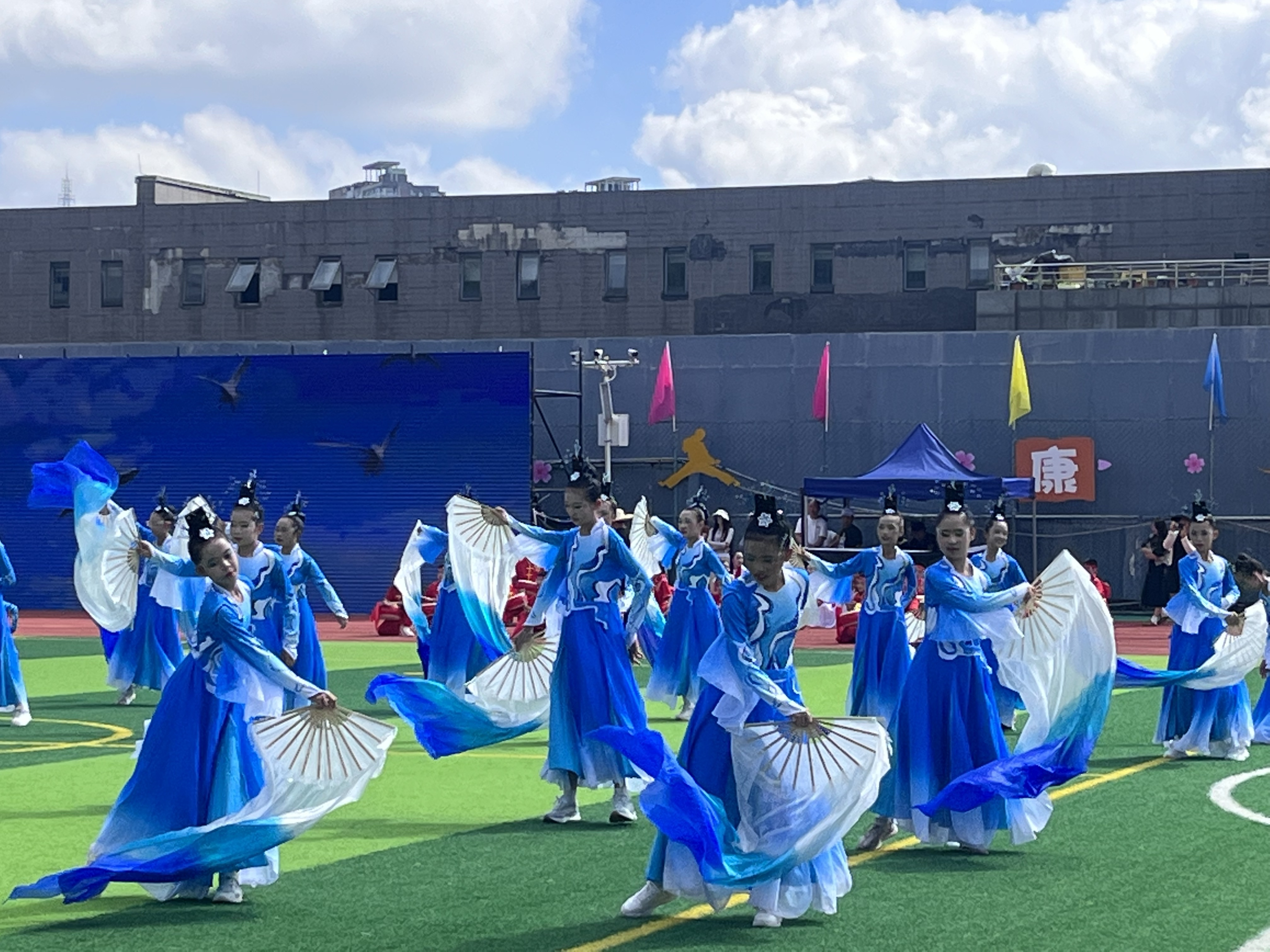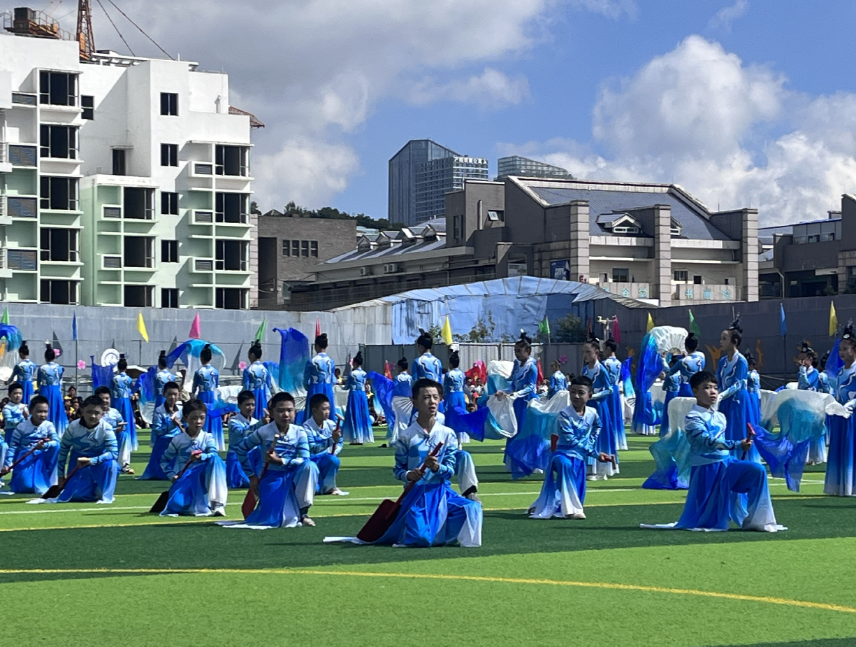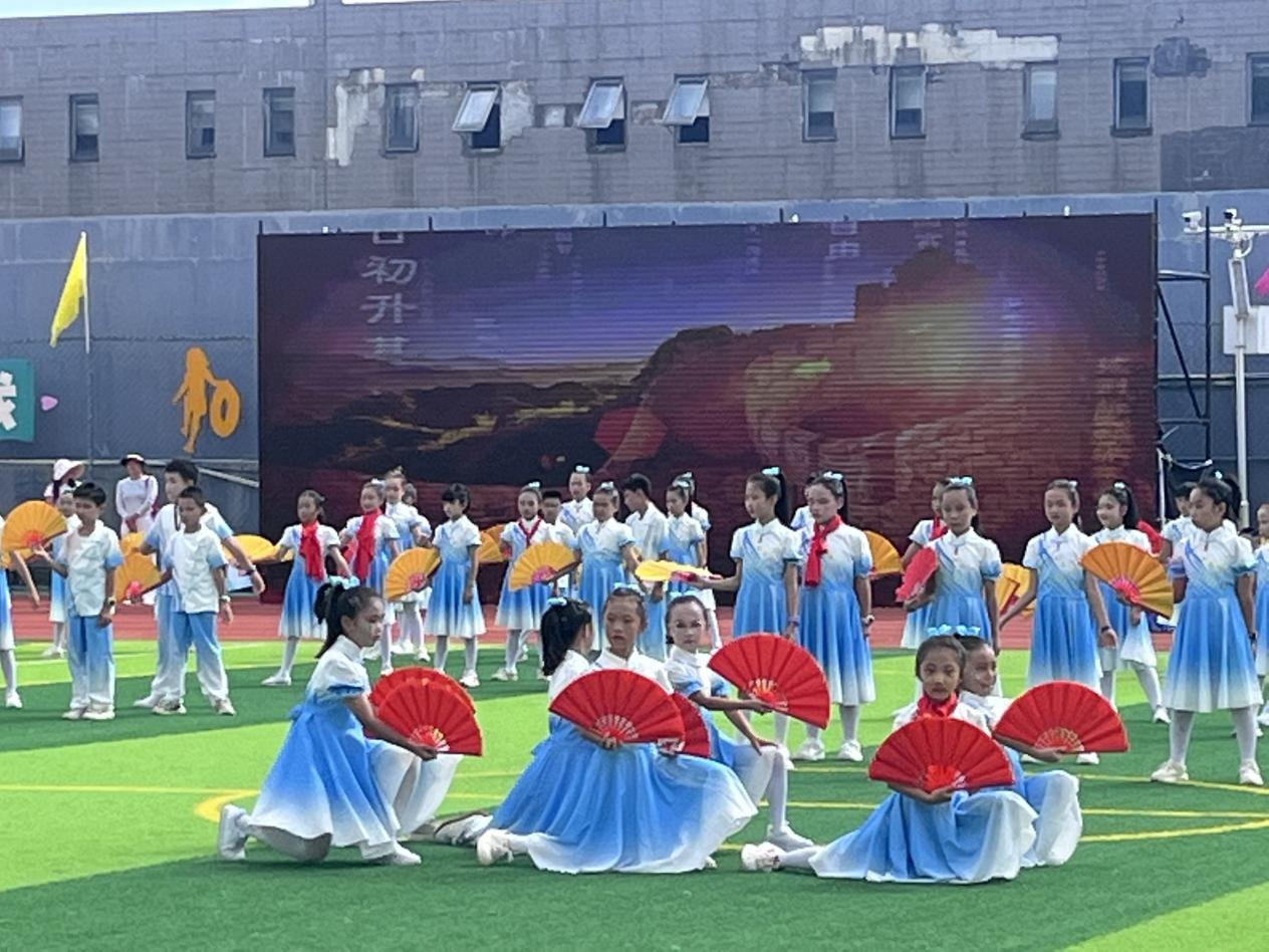 四年级以恢宏的扇舞描绘出“百川归海,大道同行”的壮丽图景。