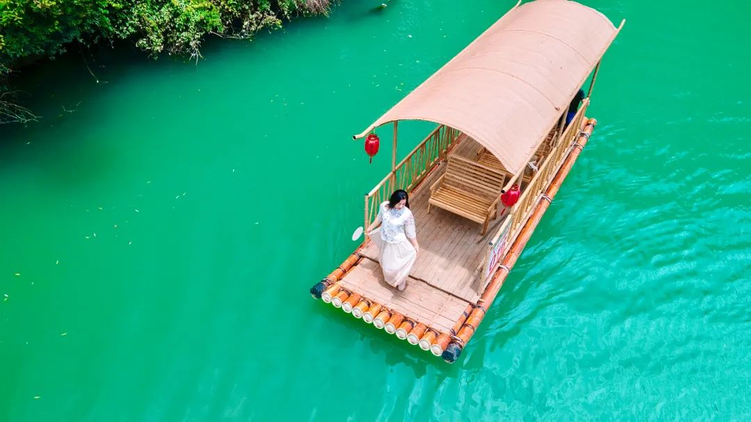 在竹筏上拍照也是绝绝子,穿上一套古典汉服,感觉自己仿若穿越到了仙侠剧的场景里,仙气飘飘。