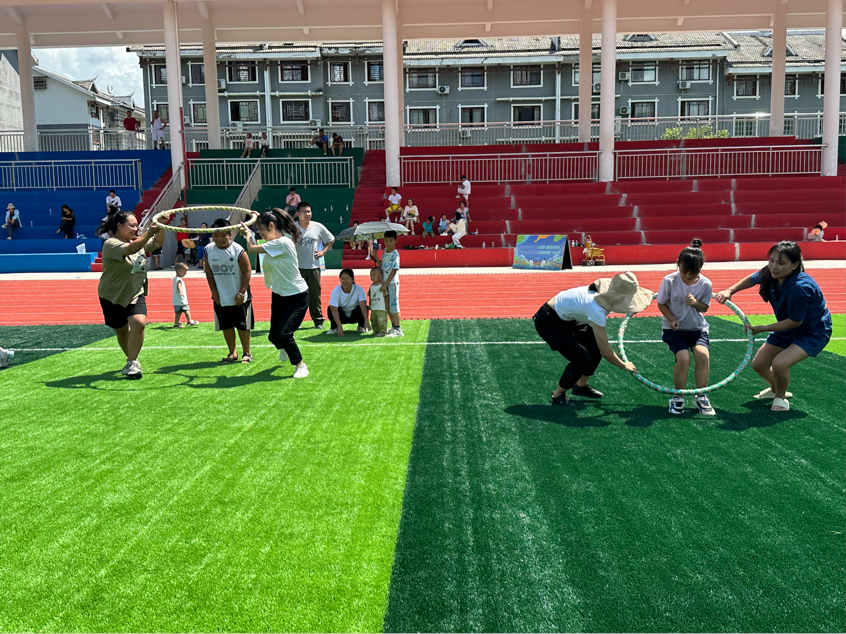 家庭赛洋溢着温馨与欢乐的氛围。乒乓球运球接力项目中,家庭成员紧密配合,全神贯注地用球拍托送乒乓球,眼神交汇间尽是默契,传递着浓浓的亲情。“过河拆桥”项目则更考验团队协作能力,一家人齐心协力,凭借默契配合稳步前行,比赛过程中欢笑声此起彼伏,现场弥漫着幸福的气息。