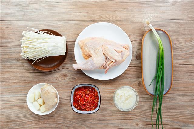 盘中放入金针菇打底,铺上鸡肉,放适量姜葱,最后淋入糟粕醋;
