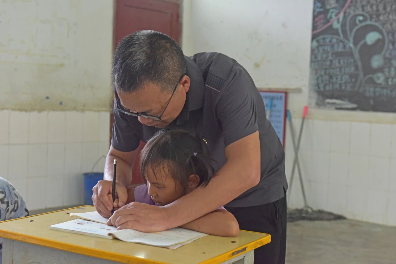 图为泥凼镇布塘小学校长吴先林教一年级的学生写字