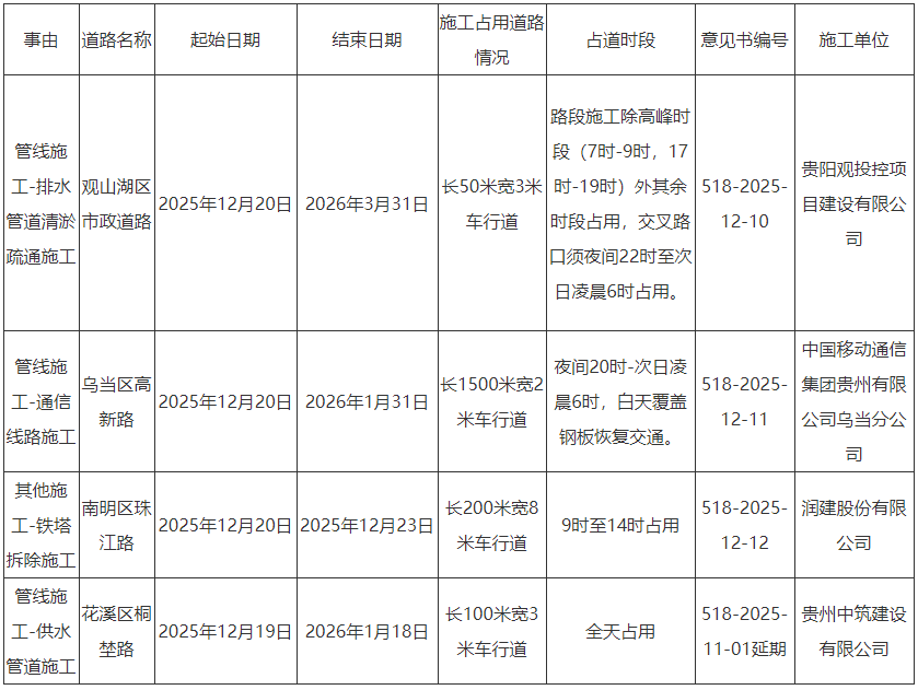 贵阳市乌当区高新路等四城区占道施工提示