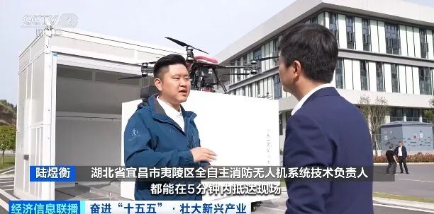 湖北省宜昌市夷陵区全自主消防无人机系统技术负责人 陆煜衡:这架防灭火的无人机,飞行速度是15米/秒。在三公里的覆盖范围内,能5分钟内抵达现场。