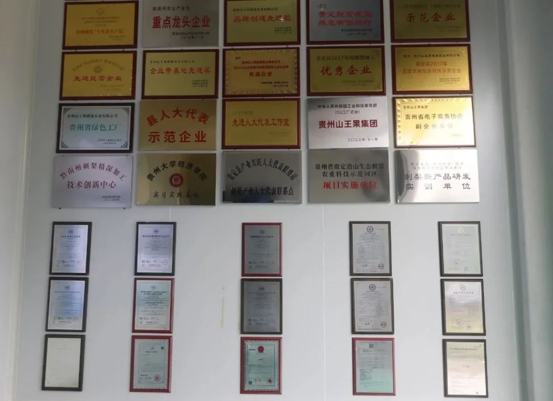 黄训才没有犹豫。既然没人收购,他就自己建厂,加工、销售。他亲自参与产品设计、工艺研发、学习食品加工技术。从2014年建园区,到2015年正式投产,刺梨汁品牌“山王果”诞生了。