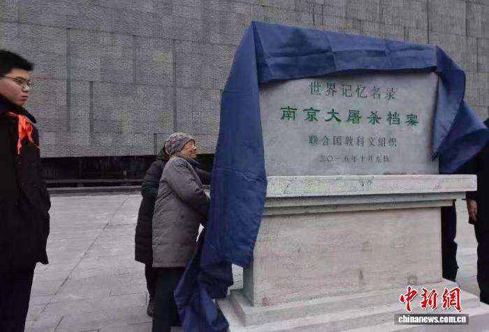 2018年12月8日,南京大屠杀幸存者夏淑琴为纪念碑揭幕。侵华日军南京大屠杀遇难同胞纪念馆 供图