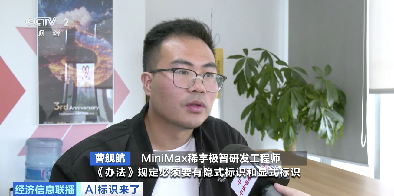 MiniMax稀宇极智研发工程师 曹舰航:《办法》规定必须有隐式标识和显式标识,用户打开我们的交互页面,就能看到人工智能的这样的标识非常醒目。同时它又带了很多的隐式信息,通过一些技术手段能找到这里面其实是带着AI的生成标识的,现在已经可以做到全链路可追踪。