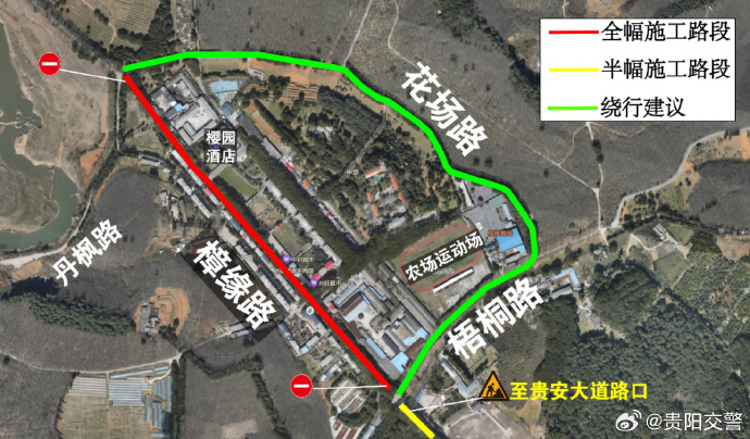 樟缘路全幅施工路段:樟缘路与梧桐路交叉口(平坝监狱路口)至花场路交叉口。