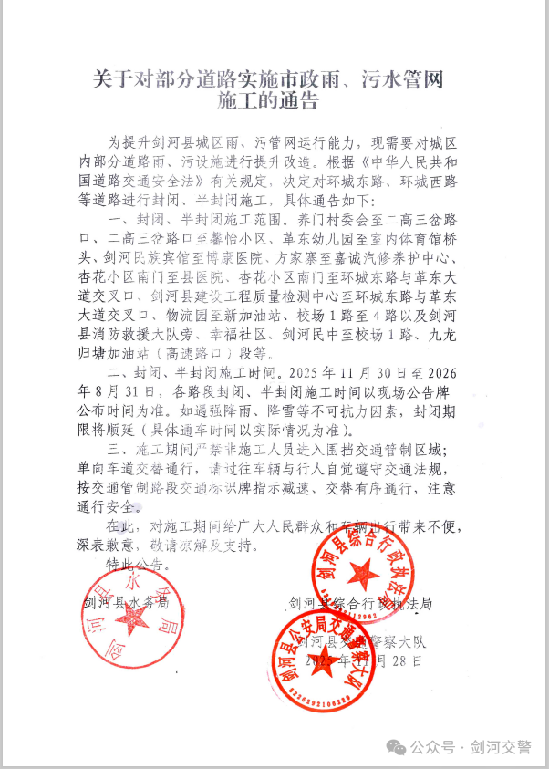 关于对剑河县部分道路实施市政雨、污水管网施工的通告