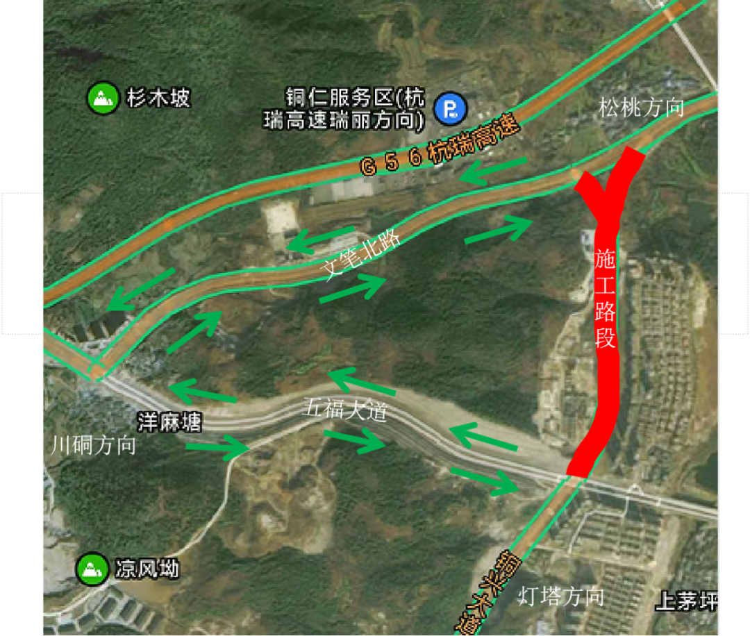 1.铜仁中心城区经铜兴大道前往铜仁凤凰机场、松桃方向车辆在碧桂园信号灯十字路口左转绕行五福大道、文笔北路通行。