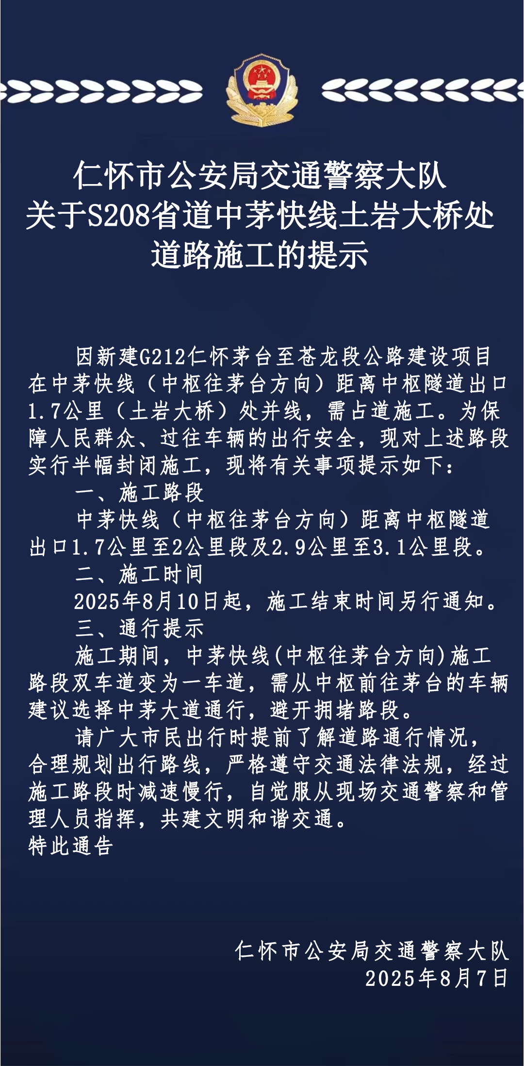 1.施工期间,封闭G212茅台镇岩滩桥至茅台二桥段双向道路,禁止所有车辆通行。