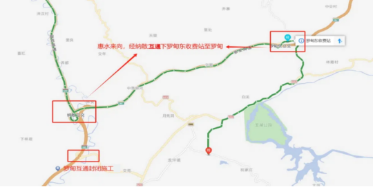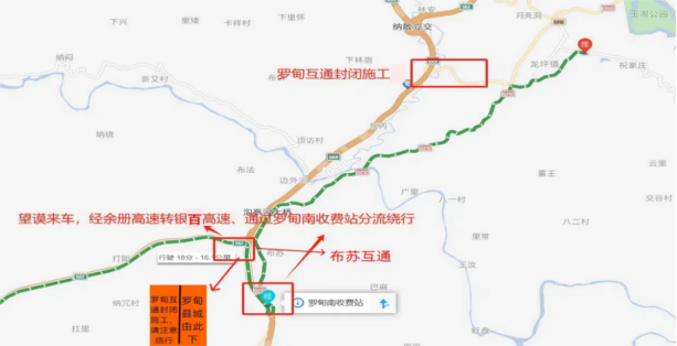 1.贵阳、惠水方向车辆最优绕行路线:银百高速——纳散互通——余册高速——罗甸东收费站绕行,罗甸互通连接线封闭后绕行距离约增9.9公里,耗时约增9分钟。另外,小车也可在罗甸北收费站下站经212国道通行,距离约增3.4公里,耗时约增15分钟。