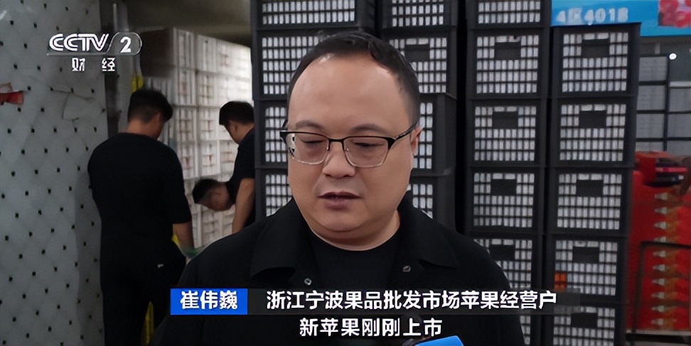 浙江宁波果品批发市场苹果经营户 崔伟巍:新苹果刚刚上市,价格大概卖4(元)左右(一斤),旺季一天大概能卖两三万斤。