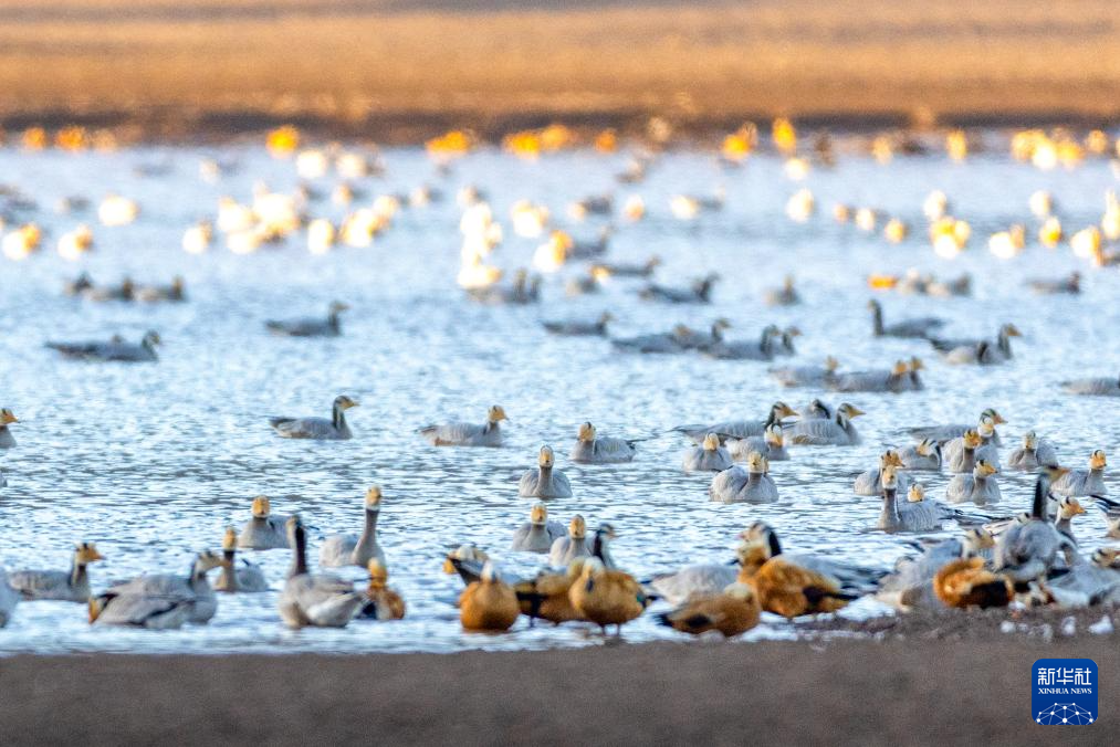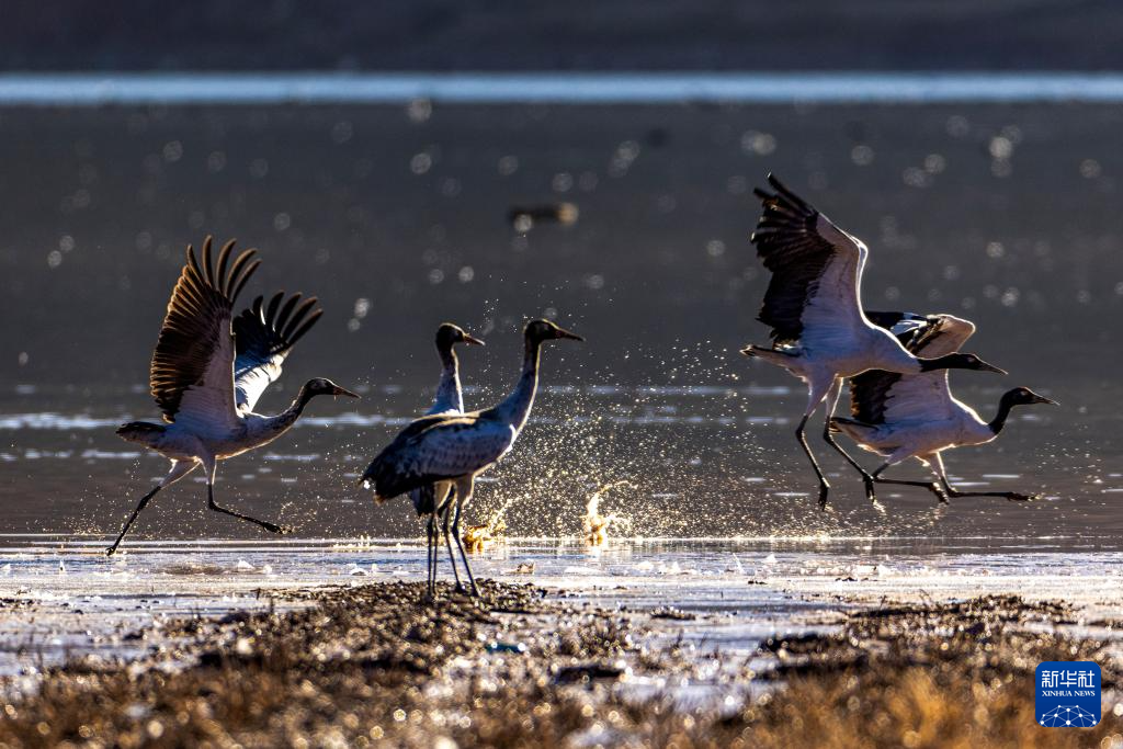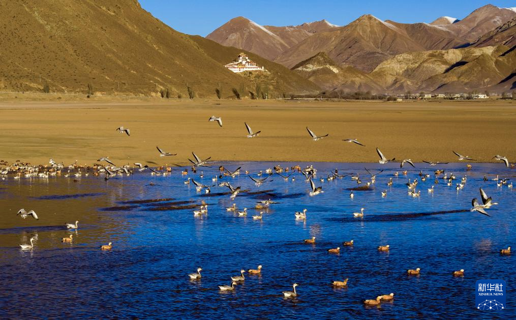 冬日时节,拉萨市林周县迎来大批越冬候鸟,黑颈鹤、斑头雁、赤麻鸭等候鸟在河谷、湖泊等地觅食、休憩。新华社记者 姜帆 摄