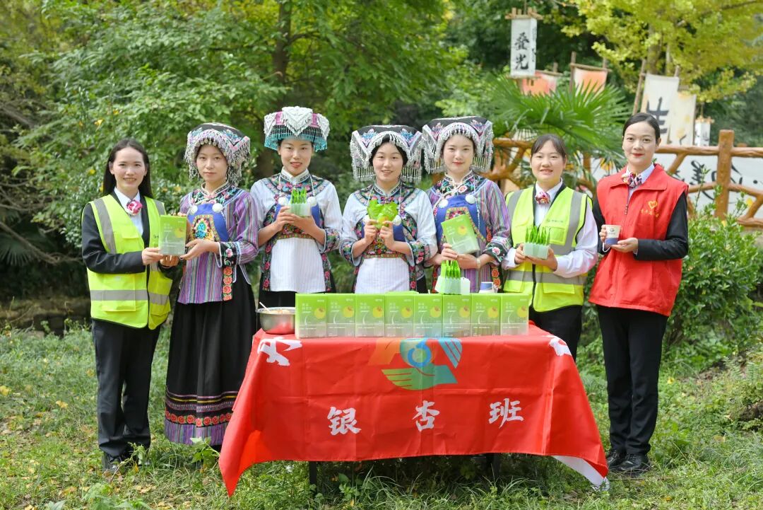 随着妥乐古银杏景区旅游高峰到来,周边车流、人流激增,景区服务压力陡增,“银杏班”成员清晨便驻守景区入口,化身交通疏导员,手持指挥棒熟练引导车辆有序停放。除了指挥交通,班组成员还积极在收费站外广场和景区入口设立便民服务点,打造司乘旅途中的温馨“驿站”,为来往游客精准提供游玩路线建议及红糖水、水果和景区特色美食银杏果、矿泉水、急救药品等贴心物资,讲解本地非物质文化遗产的历史和特色,让游客在欣赏美景之余,深度感受地方文化魅力。同时,还将本地特色农产品带到景区,协助当地农户推广销售,助力乡村振兴。