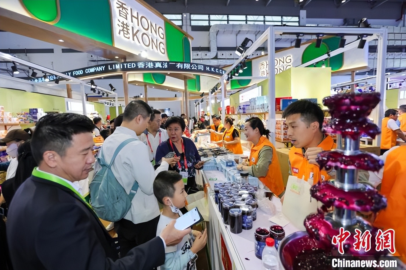 4月13日,海南海口,第五届中国国际消费品博览会香港时尚馆开馆。图为参观者在香港时尚馆选购特色美食。 中新网记者 骆云飞 摄