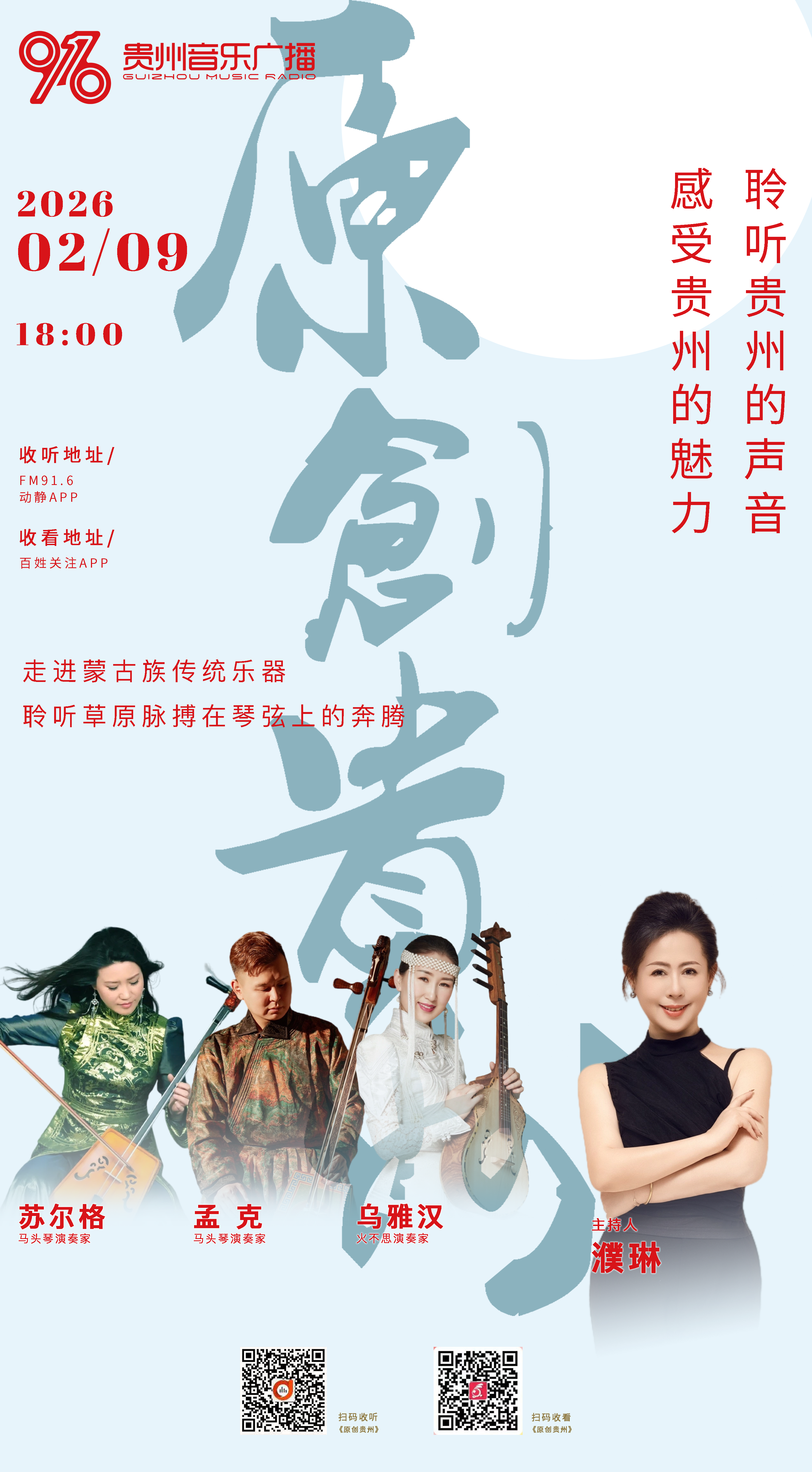 FM91.6贵州音乐广播2月9日18:00《原创贵州特别节目·对话》马头琴演奏家孟克、苏尔格、火不思演奏家乌雅汉,走进蒙古族具有代表性的传统乐器,聆听草原脉搏在琴弦上的奔腾。