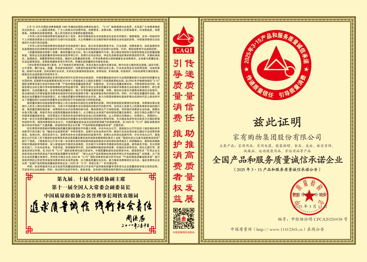 此次荣获中国质量检验协会颁发的荣誉,不仅是对家有购物过往努力的肯定,更是未来持续奋进的动力。展望未来,家有购物将继续秉持初心,把对品质的执着和诚信经营的理念融入到每一个业务环节中,为消费者提供更丰富优质的商品、更贴心周到的服务。