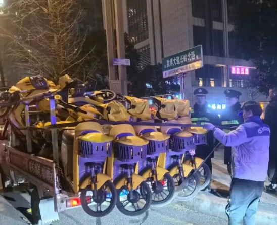 联合整治行动从上午7时开始,一直持续到次日凌晨4点结束,3家执法部门共出动执法人员百余人次,出动执法车辆30余辆次,拖离无牌及乱停乱放共享电单车辆3800余台辆。