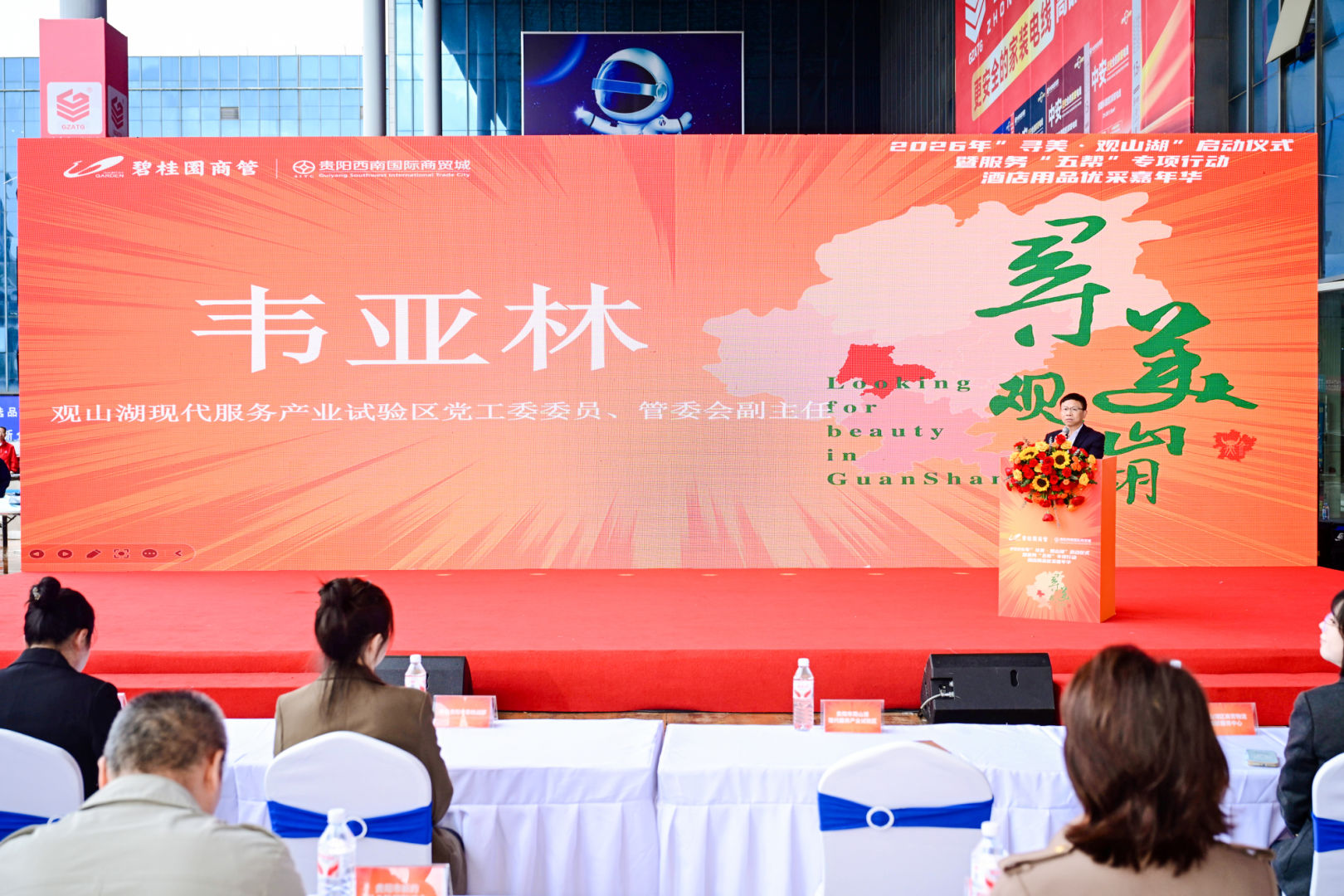 活动在“寻美·观山湖”主题宣传片中拉开序幕。观山湖现代服务产业试验区党工委委员、管委会副主任韦亚林在致辞中表示,“寻美·观山湖”寻的是发展之美,聚的是奋进之力。他回顾了过去一年通过组织百余位网络达人创作短视频、与主流媒体合作等方式,显著提升了区域知名度和美誉度的成果。他强调,本次嘉年华将把“找订单、增融资、降成本、解难题、送政策”的“五帮”行动落到实处,为企业搭建面对面交流平台,集中展示酒店布草、客房用品、厨房设备等全产业链产品,推动传统商贸向现代化、集约化、服务型方向升级。