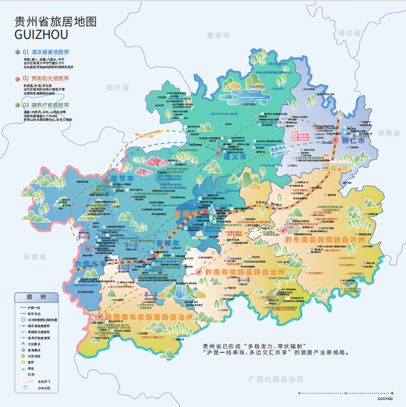 贵 州 省 已 形 成 “ 多 极 发 力 、带 状 辐 射 ”“ 沪 昆 一 线 串 珠 ,多 边 交 汇 共 享 ” 的 旅 居 产 业 新 格 局 。
